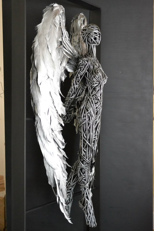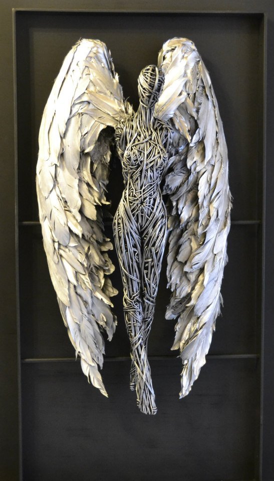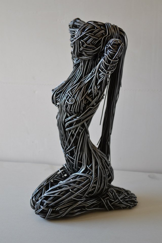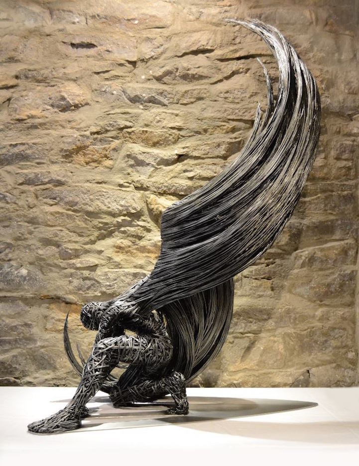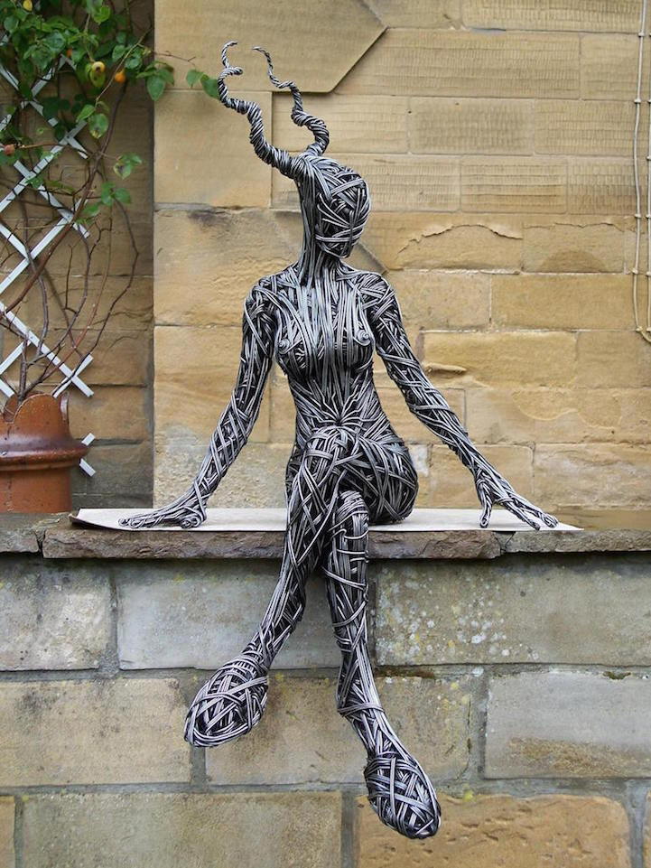 English artist Richard Stainthorp captures the beautiful energy and fluidity of the human body using wire. The life-sized sculptures feature both figures in motion and at rest, expressed in the form of large-gauged strands that are densely wrapped around and through one another. By doing this, he gives the work an undeniable presence. Stainthorp also allows the bent wires to shine by keeping their metallic appearance free from any obvious painting or additions.