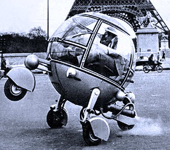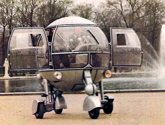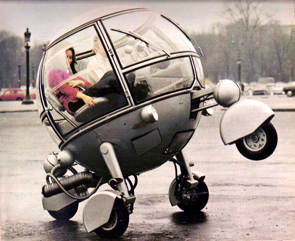 Pussycar Automodule, 1968. Designed by Jean Pierre Ponthieu and billed as ‘The Car of the Year 2000′, the spherical Automodule was powered by a 250cc single cylinder engine powering the single rear wheel, which caused the car to “rear-up” under acceleration. Because the other three wheels where all steerable, the car could spin on its axis. There are no words…
