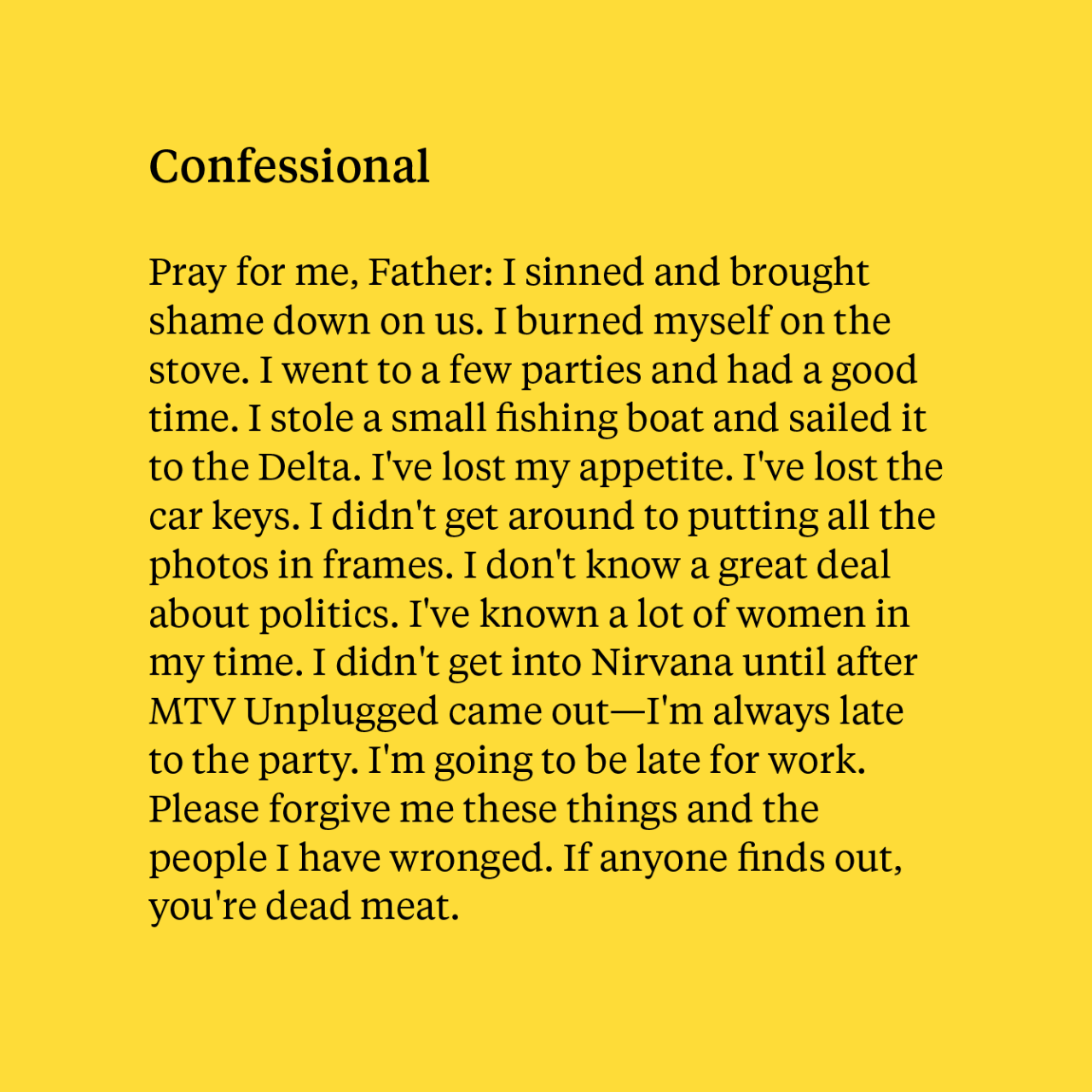 I’ve been experimenting with writing very, very short stories made up entirely of the example sentences given for words in the dictionary, with nothing added except a little punctuation to piece them together.