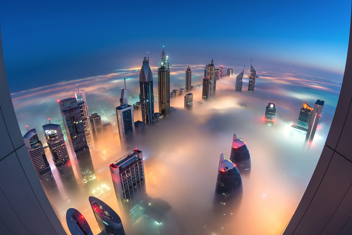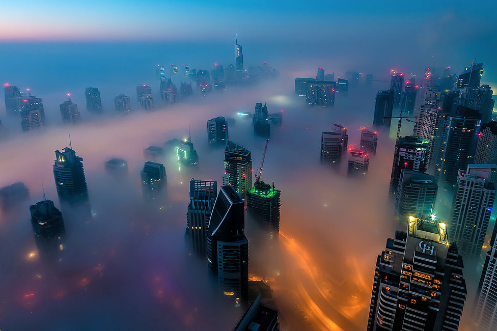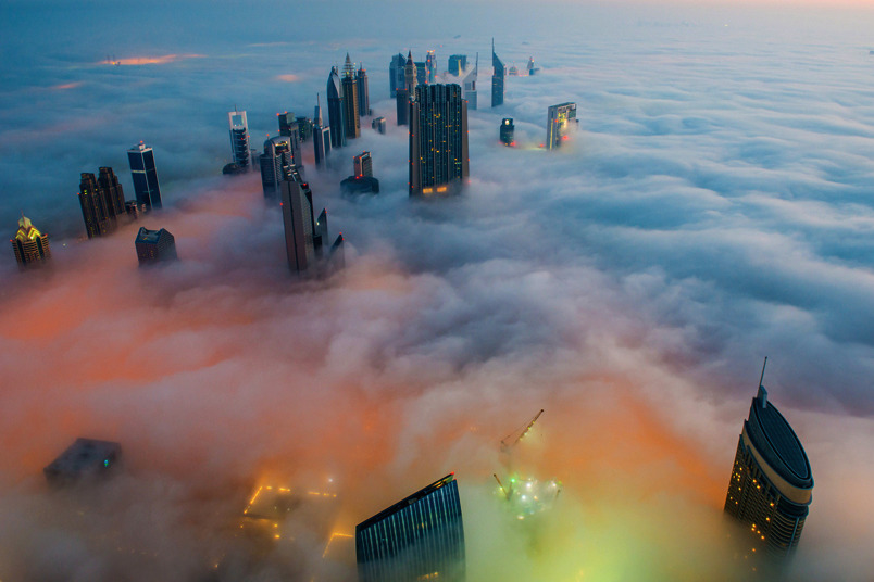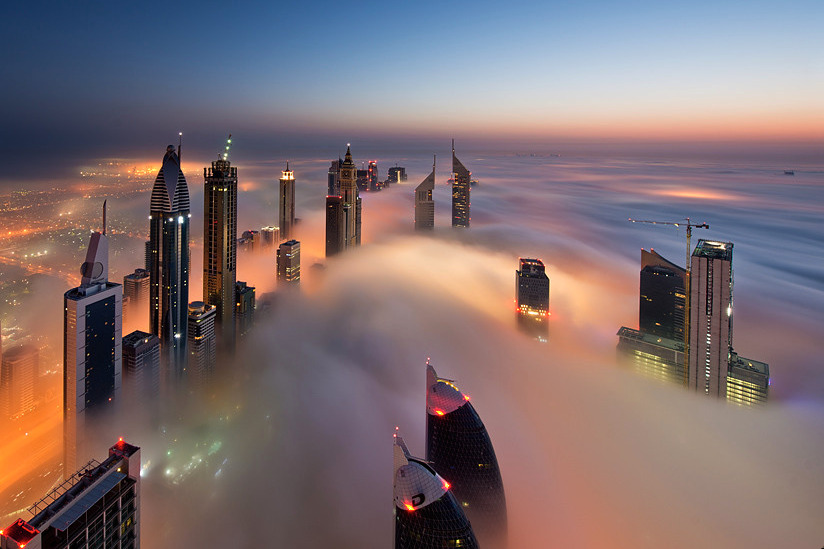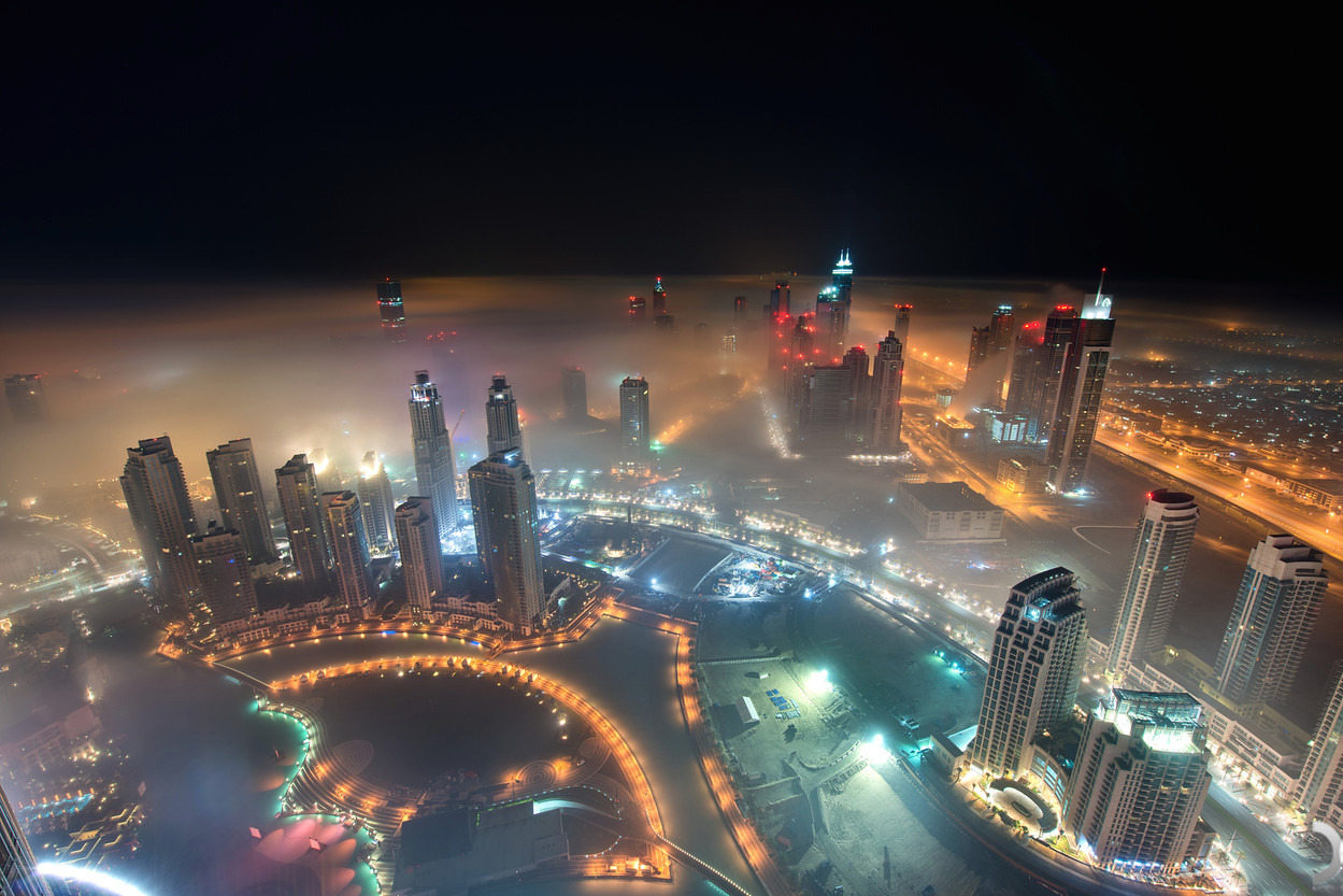 photos from dubai’s 828 meter tall burj khalifa (save the first and last photos, which show the building) by (click pic) daniel cheong, karim nafatni, bjoern lauen and dave alexander. duabai only experiences this in september and march, when seasonal changes in temperature creates an abundance of early morning fog. (see also: fog over new york, london and chicago)