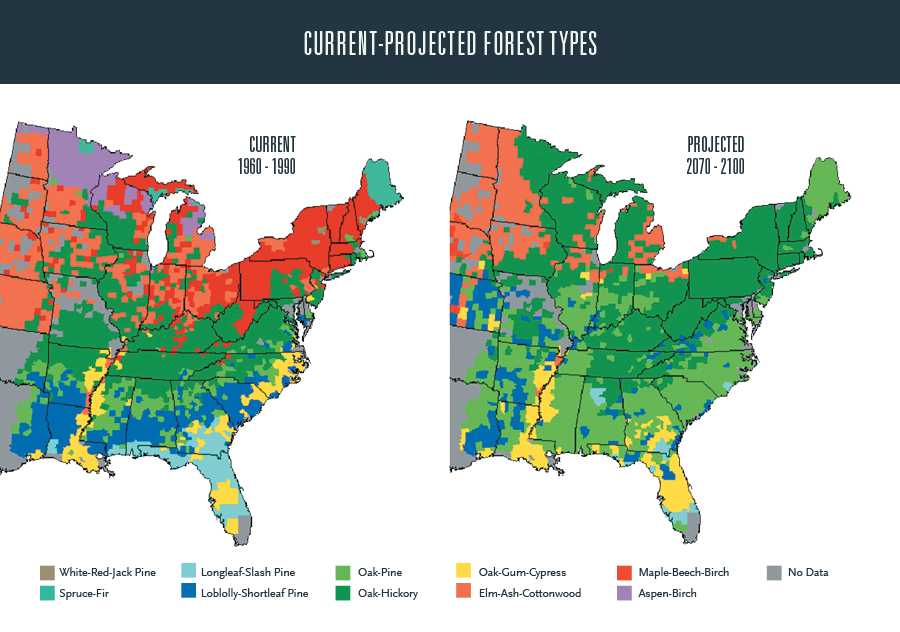 Shifting forest ecosystems in eastern United States due to climate change.