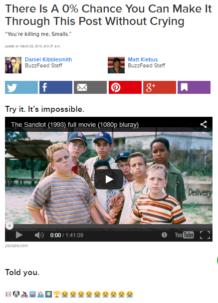 this buzzfeed article has two staff members that worked on it, six total words, over twice as many emojis, and a full youtube rip of the sandlot. this is the fucking end of click bait websites. this is the epitaph of hell. what the fuck is buzzfeed even doing anymore