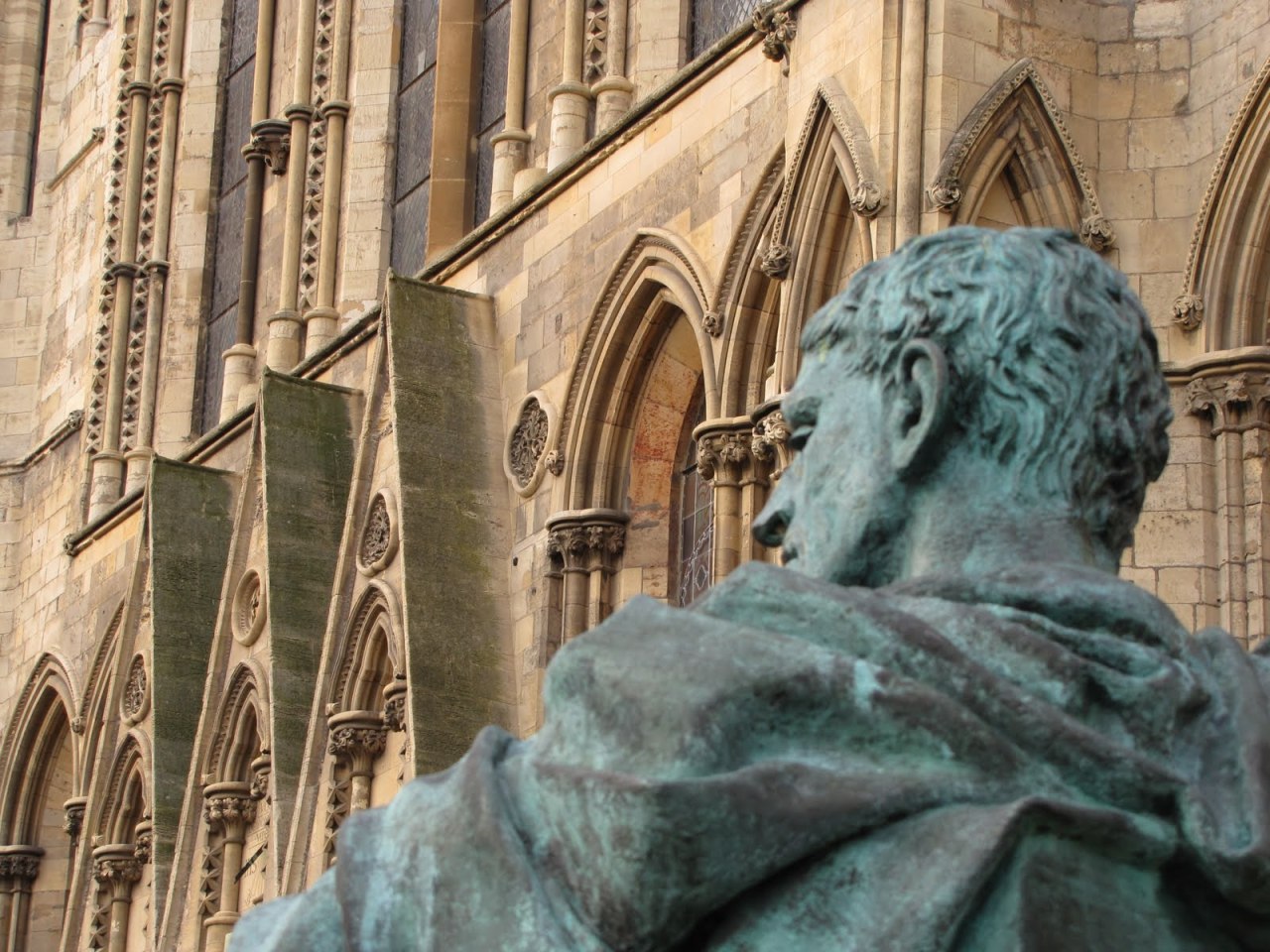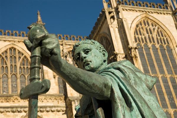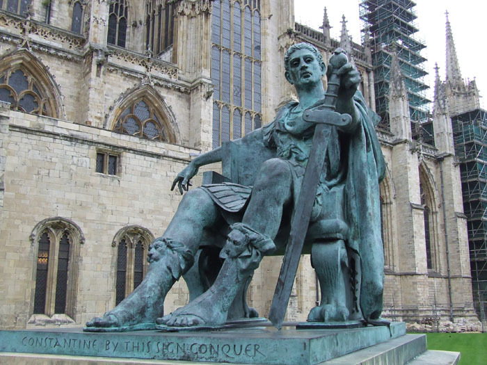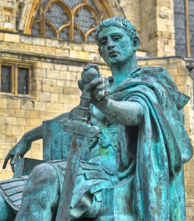 Statue of Roman emperor Constantine The Great, by sculptor Philip Jackson, outside York Minster church in York, North Yorkshire, England. Constantine had been serving alongside his father Flavius Constantius (Constantius Chlorus), in AD 305, in Roman Britain, in military campaigns against the Picts. When Constantius, who was Caesar of the western provinces of Rome, took ill in 306, he named his son his successor, and after his death the Roman army in Britain, in the town of Eboracum, modern York, proclaimed Constantine Emperor of Rome.