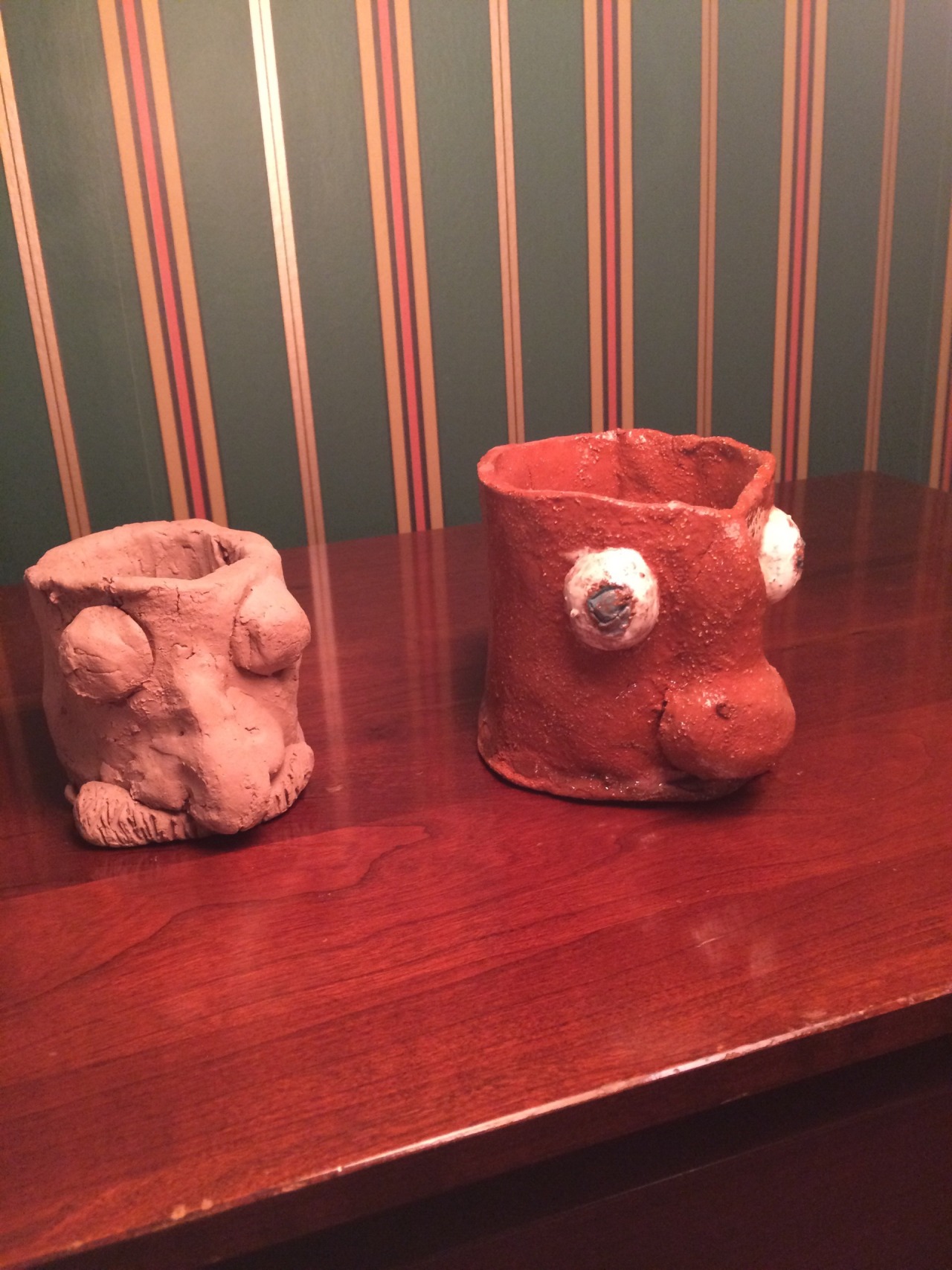 Bug-eyed mug & uncle pencilholder. Me, ceramic, 2nd-5th grade?
