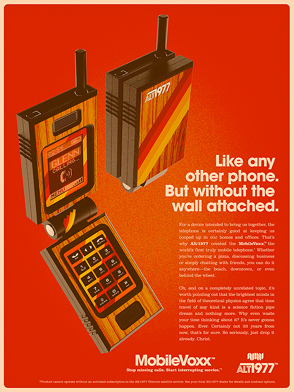 “Re-imagining four common products from 2010 as if they were designed in 1977: an mp3 player, a laptop, a mobile phone and a handheld video game system. I then created a series of fictitious but stylistically accurate print ads to market them.”