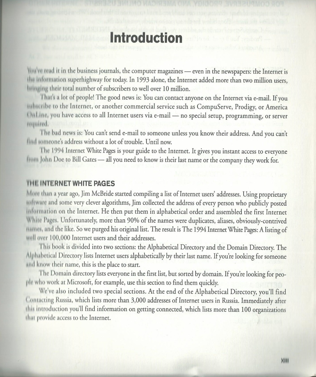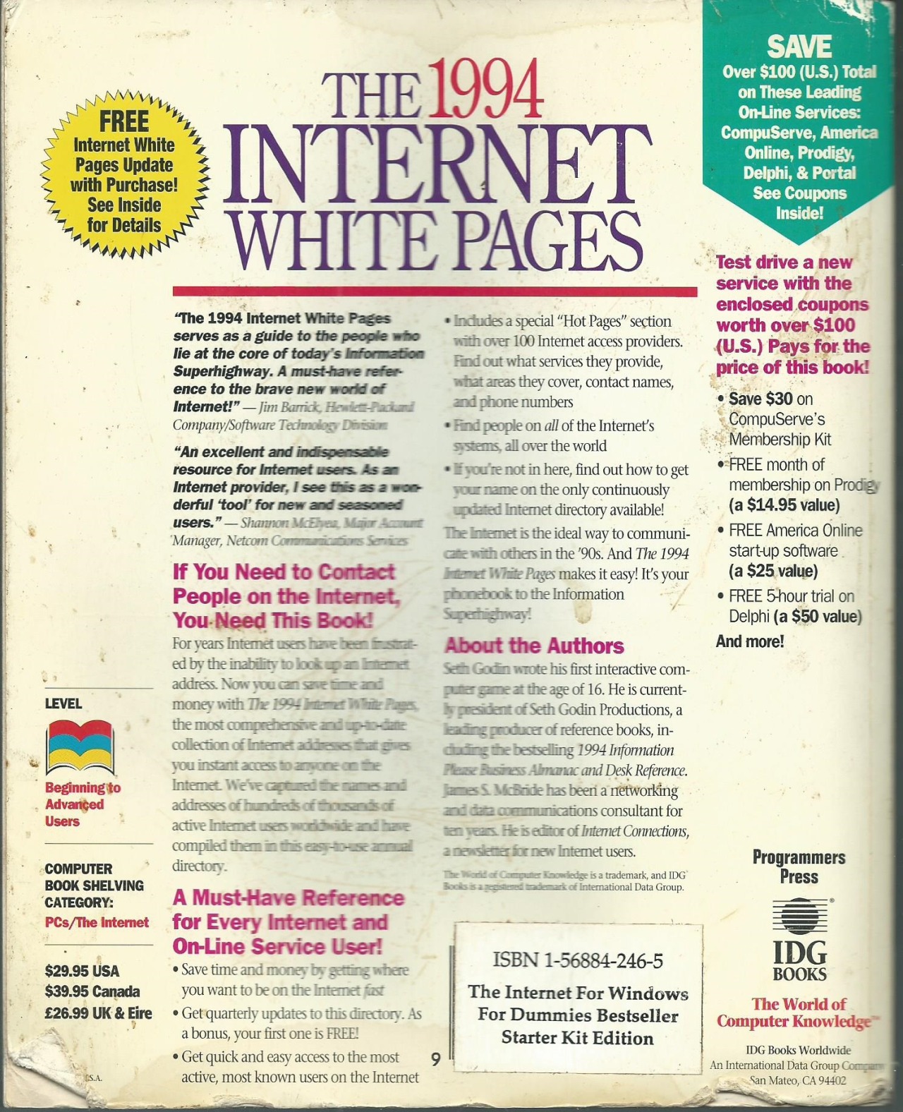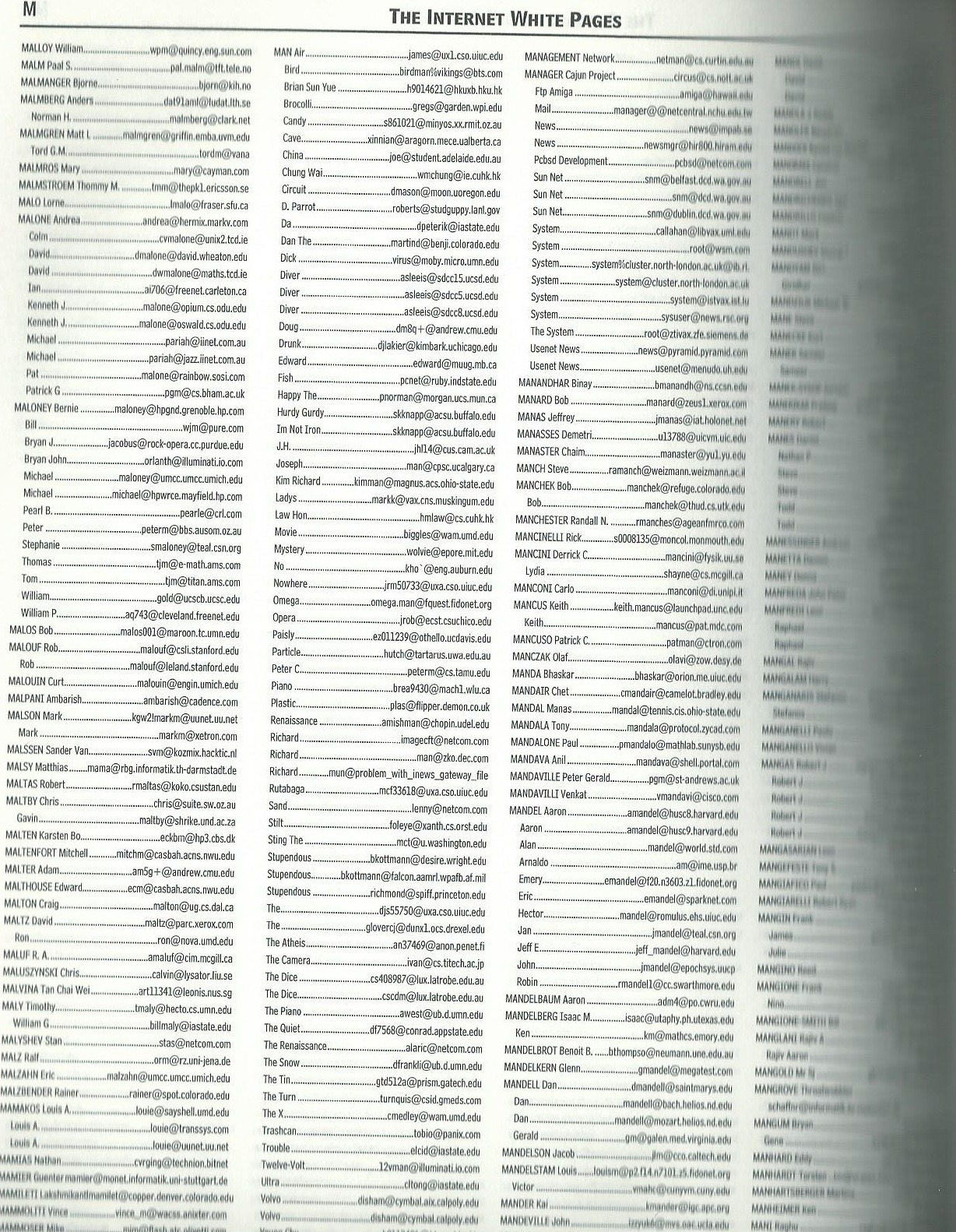 Yo check out what I got today! It’s a book from the early 90s that attempts to list every person online with their email address, in the manner of a phone book. This was to be the first in series, but they never released a “1995″ edition much less a later one. Not sure if the free update mailings ever happened either.