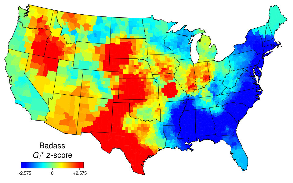 Relative frequency of the word “badass” in US geotagged tweets.