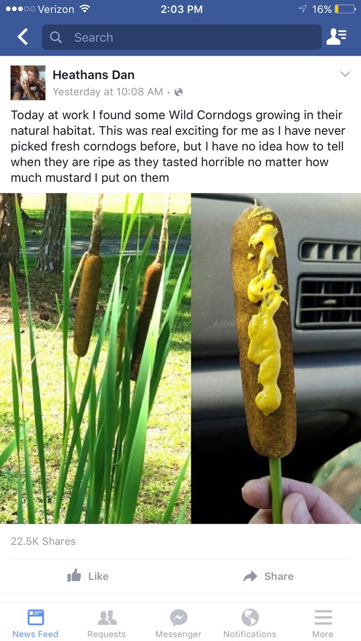 the thing is, what this person has in their photo is a BROWN flower spike, meaning that it’s starting to go to seed and is probably a tasteless mouthful of either fiber or fluff. regardless of whether the post is a joke or serious, out of all the edible parts of the cattail, op managed to pick one of the ONLY parts of the plant that isn’t. and i still can’t get over that.