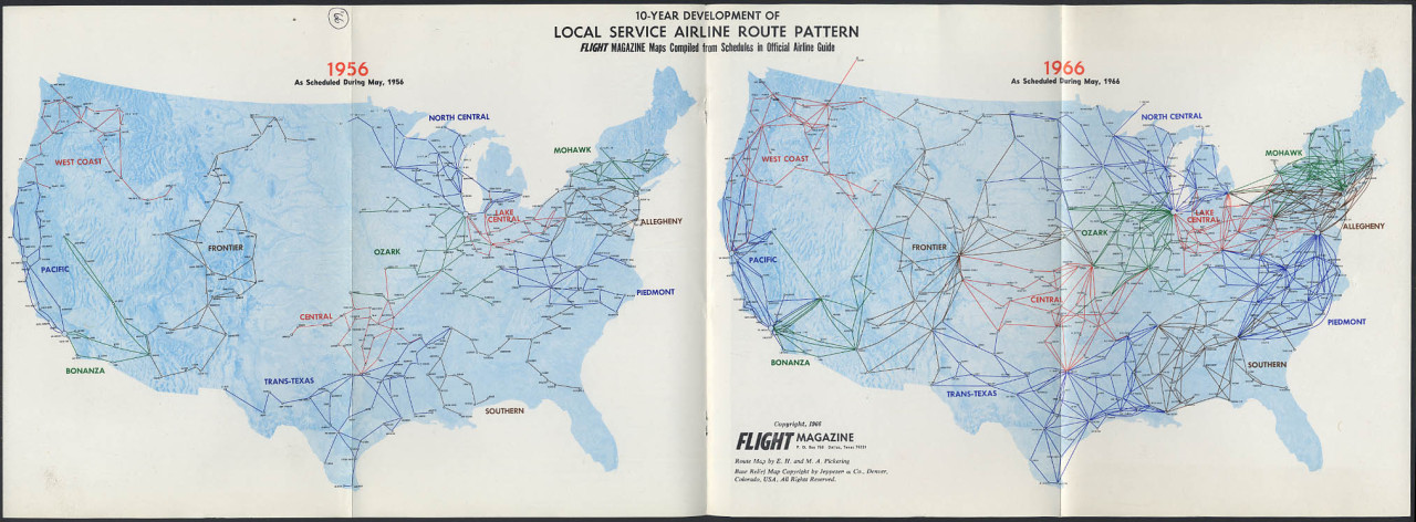 10-year development of local service airline route pattern in the USA, 1956-1966.