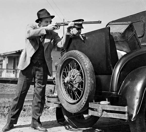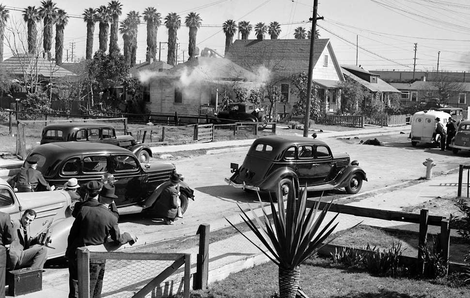 Feb. 17, 1938: Tear gas drifts from a home in the 1700 block of East 22nd Street as Los Angeles police trade gunfire with barricaded suspect George Farley. The bodies of a deputy city marshal and his helper — shot and killed by Farley as they tried to serve an eviction notice on him — lie in front of the barricaded home. Killed were Deputy Marshal T. Dwight Crittenden and Leon W. Romer, both 60.