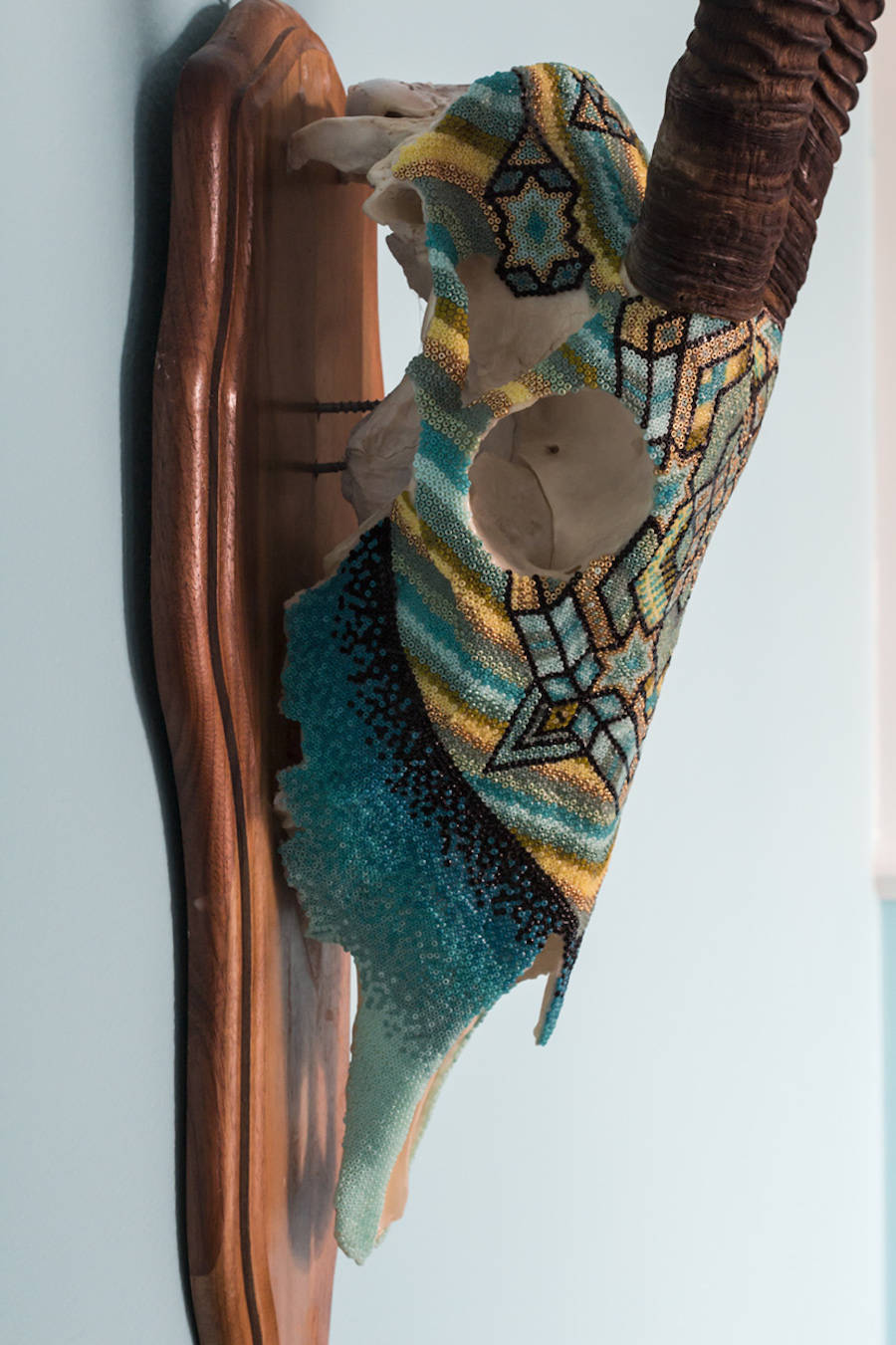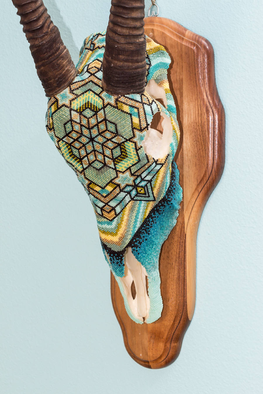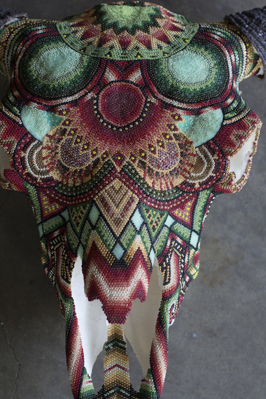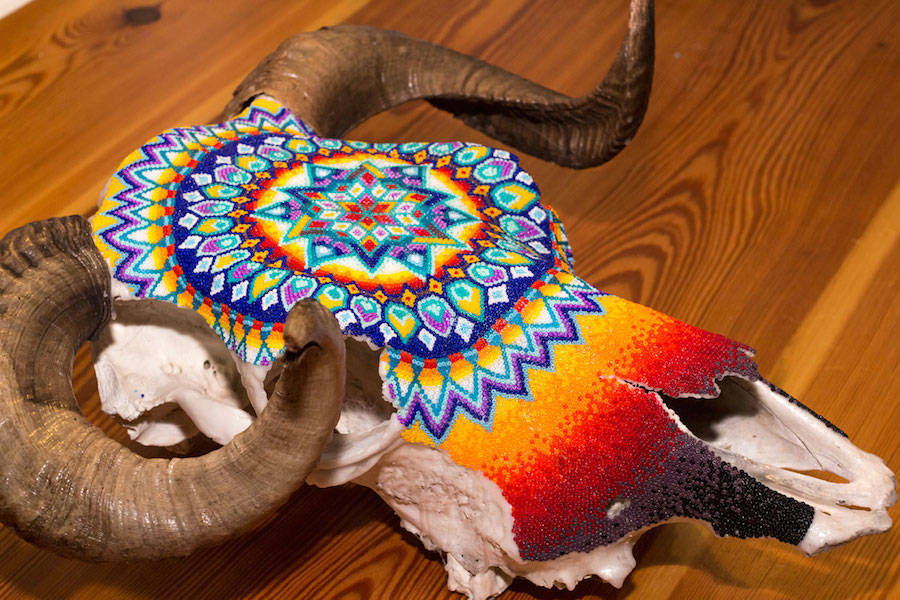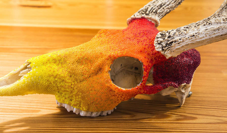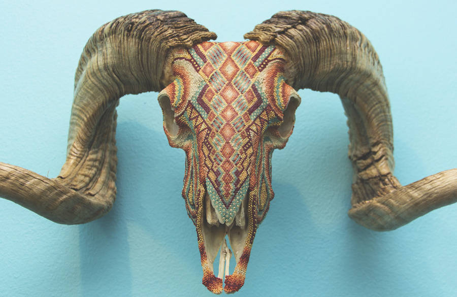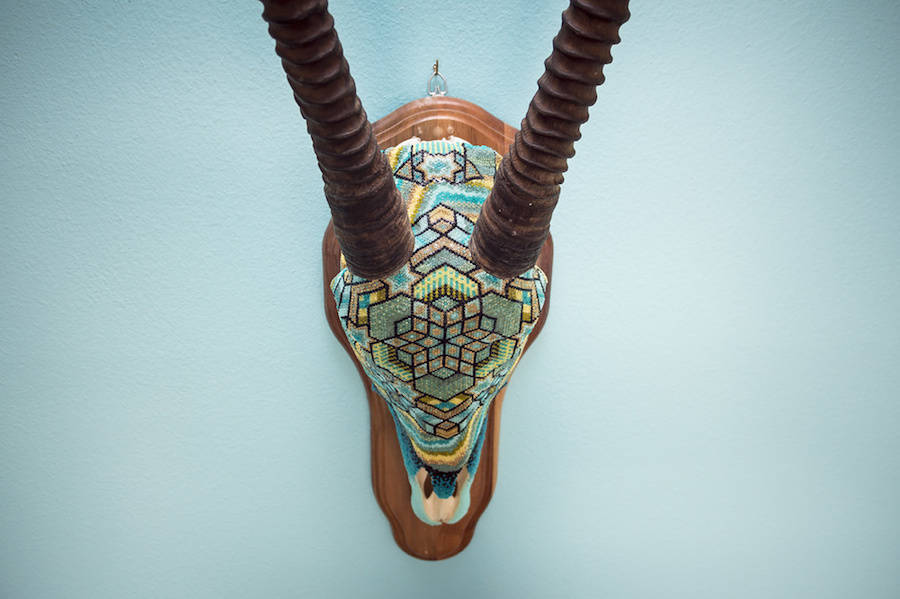 Harison Carter Watkins is a Texas-based graphic designer who adorns horned animals skulls with colorful beads. He uses paraffin was, pine resin and a mix of beeswax to fix his beads and shape aztec and geometric patterns, referring to his native southwest. Source: fubiz