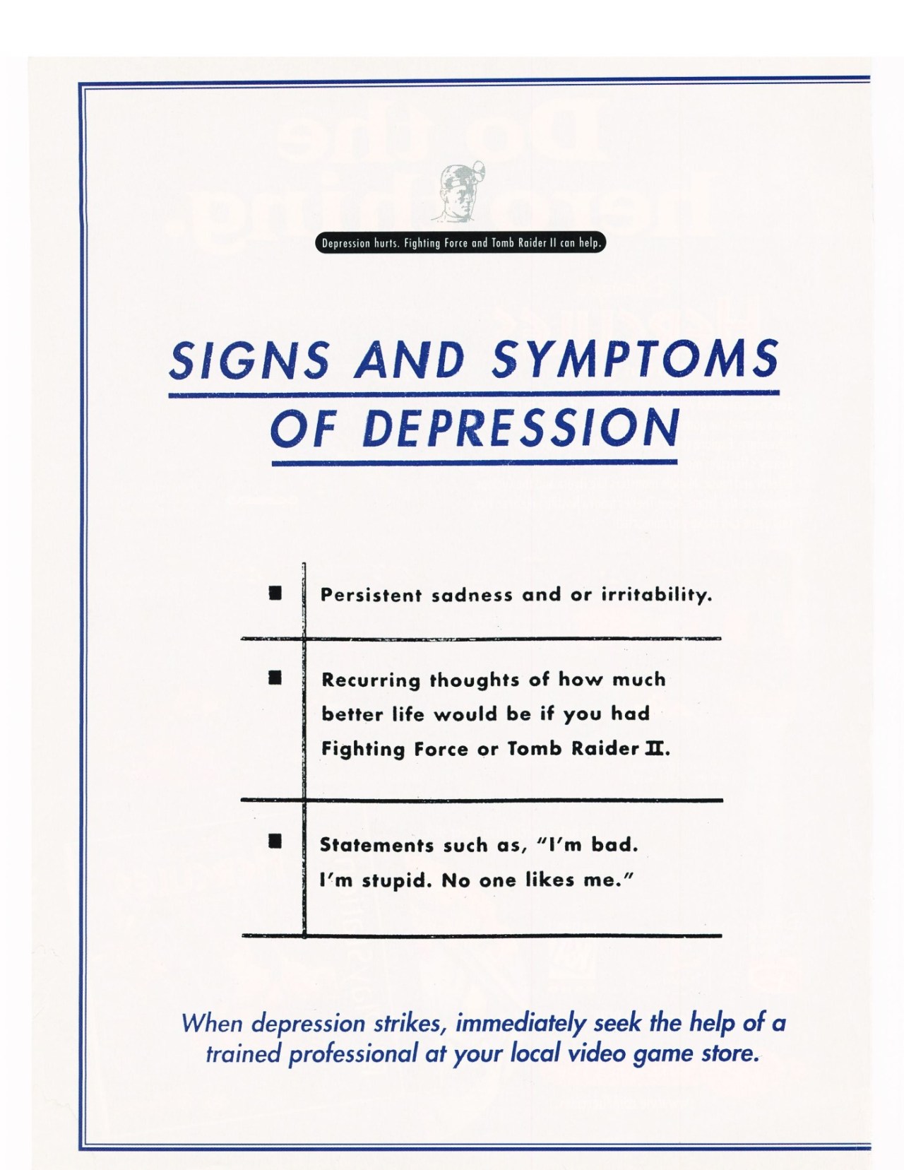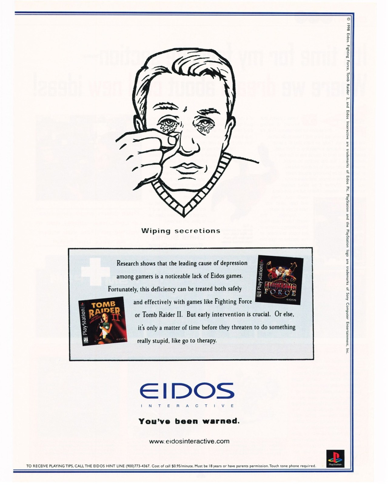 “Research shows that the leading cause of depression among gamers is a noticable lack of @Eidos games” [Follow Old Game Mags]...