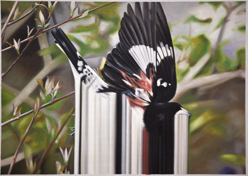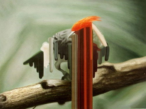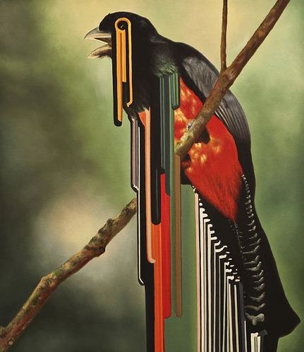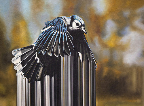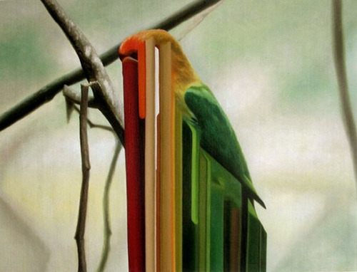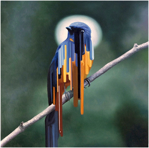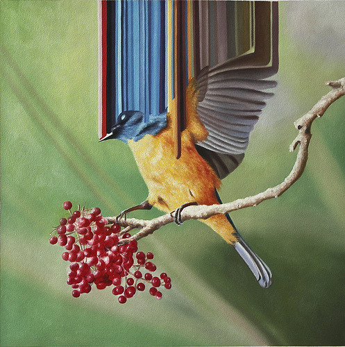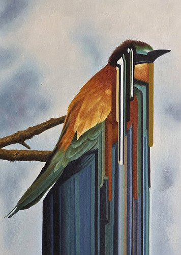 Maurizio Bongiovanni (1979) is an italian artist. His work is placed right in the middle between realism and abstraction. This kind of research is mainly expressed in his birds series. In these oil on canvases streams of colors are generated from realistic colorful birds, in a perfect mix between different kinds of art styles. The result is stunning.
