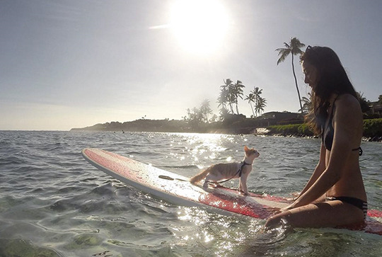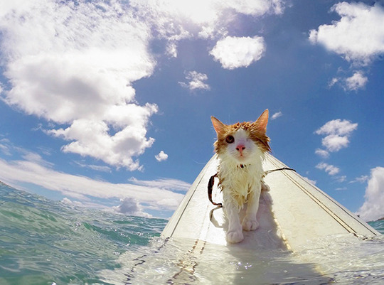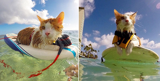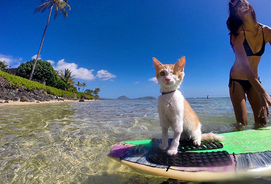 As far as surfing cats go, Kuli is a pro - although he does wear a teeny-tiny-yet-functional life preserver on occasion.