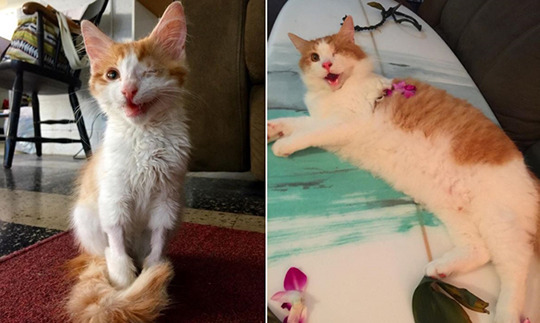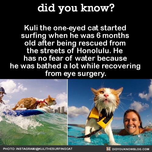 Kuli the one-eyed cat started surfing when he was 6 months old after being rescued from the streets of Honolulu. He has no fear of water because he was bathed a lot while recovering from eye surgery.