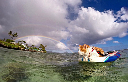 I just want to point out that you may never again see another photo that includes a one-eyed cat, drenched in water, floating on a surfboard, perfectly chill, in front of a double rainbow.