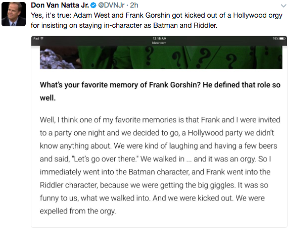 can you IMAGINE seeing adam west walk into an orgy and just start Being Batman… holy shit