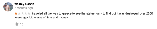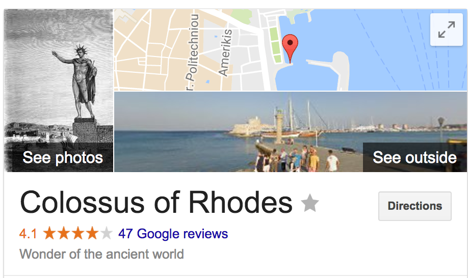 The Colossus of Rhodes, a statue that was destroyed over 2000 years ago, has a 4.1 stars score on Google reviews.