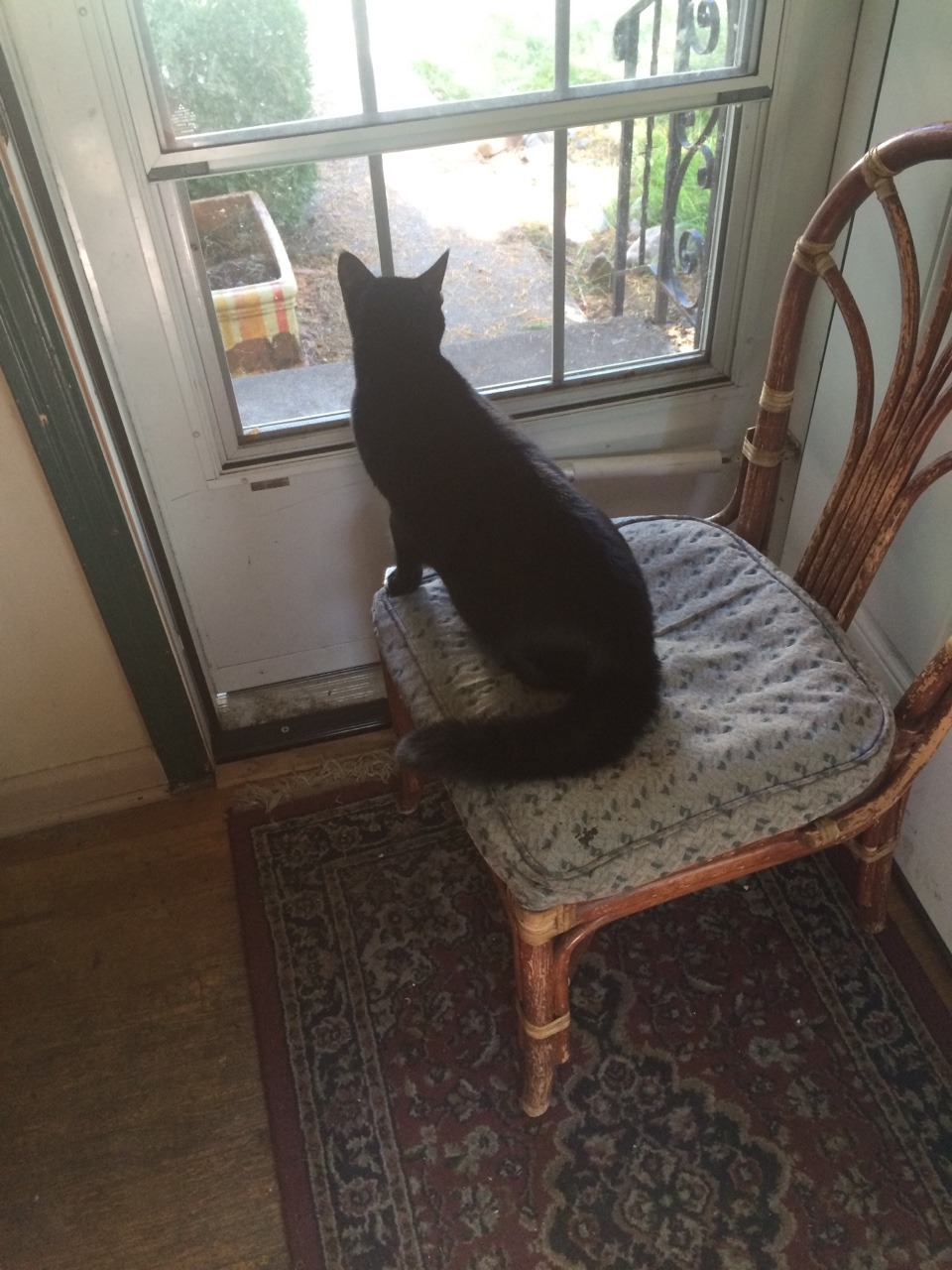 a curious dog came sniffing up to the door and he puffed out his tail