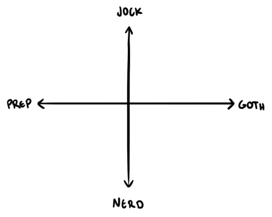 jock is NOT the opposite of goth. prep is the opposite of goth, and nerd is the opposite of jock. like this