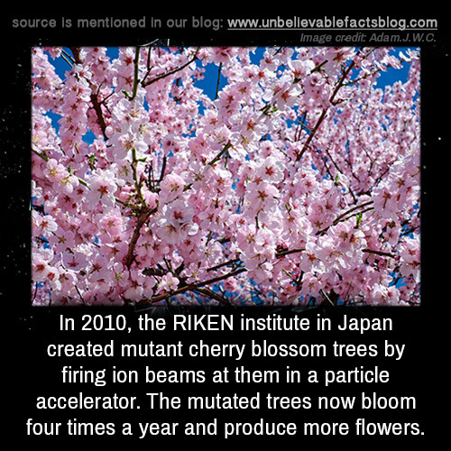 In 2010, the RIKEN institute in Japan created mutant cherry blossom trees by firing ion beams at them in a particle accelerator. The mutated trees now bloom four times a year and produce more flowers.