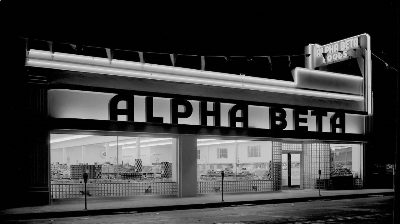 Alpha Beta grocery store at night, c1937 (via here)