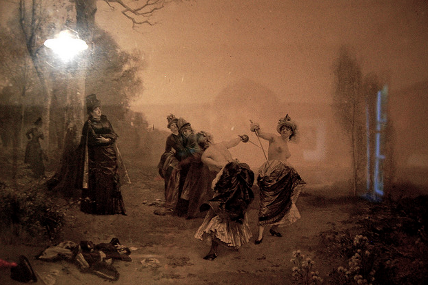 “The most intriguing duel fought between women, and the sole one that featured exposed breasts, took place in August 1892 in Verduz, the capitol of Liechtenstein, between Princess Pauline Metternich and the Countess Kielmannsegg. It has gone down in history as the first “emancipated duel” because all parties involved, including the principals and their seconds were female… Before the proceedings began, the baroness pointed out that many insignificant injuries in duels often became septic due to strips of clothing being driven into the wound by the point of a sword. To counter this danger she prudently suggested that both parties should fight stripped of any garments above the waist. Certainly, Baroness Lubinska was ahead of her time, taking an even more radical take on the (at the time) widely dismissed theories of British surgeon Joseph Lister, who in 1870 revolutionized surgical procedures with the introduction of antiseptic.