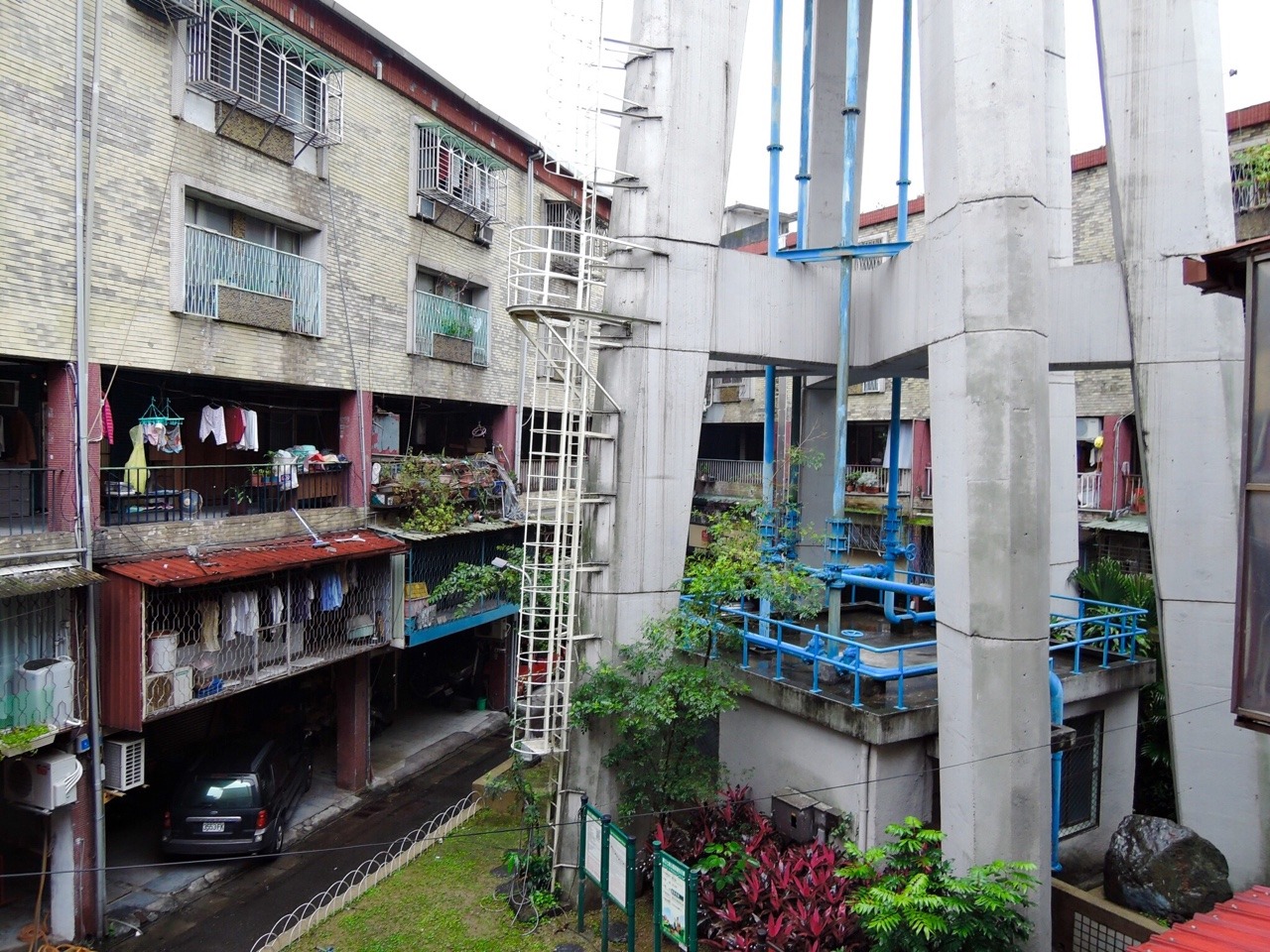 龍山寺近くの環状道路に沿って建てられた集合住宅。交差点を4棟の4階建住宅が取り囲み、さらにそれらを歩道橋が繋いでいる特異な造り。