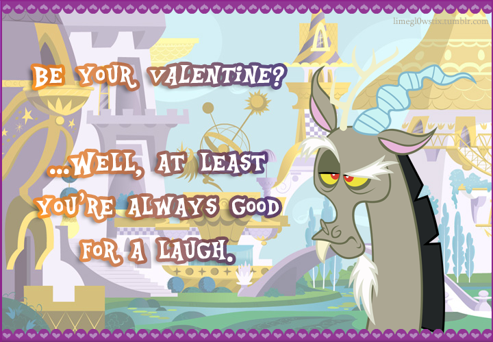 Backgrounds & other characters made using the official Hasbro Valentine’s Day Card CreatorEnjoy everyone, and happy Valentine’s Day! Or, for those “forever alone” types, enjoy your Discord valentine.