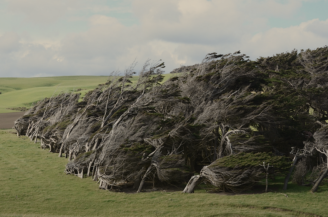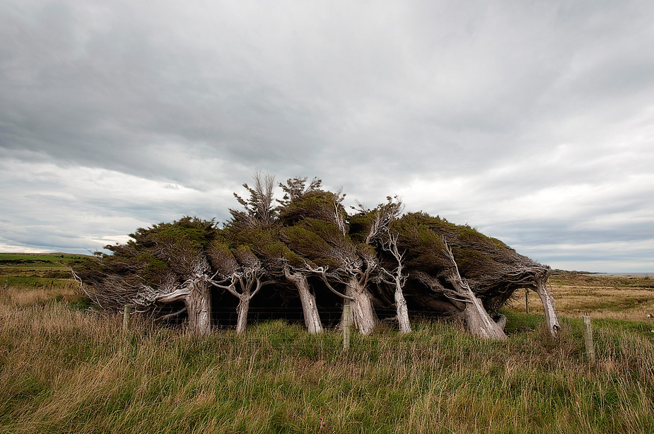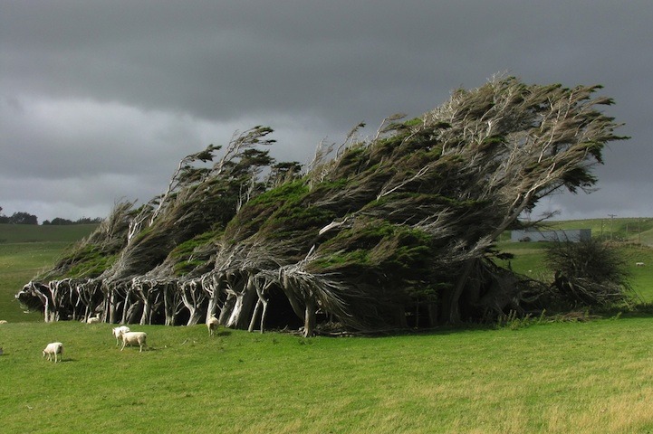 slope point, the southernmost tip on new zealand’s south island, is hit with such persistently violent northern antarctic winds that trees grow in the windward direction. (click pic or link for credit x, x, x, x, x, x)