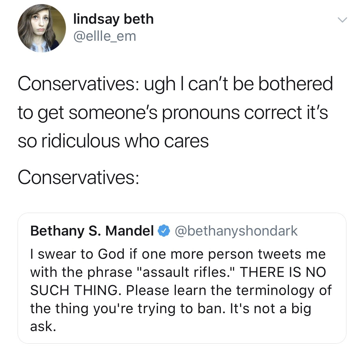 While I am sympathetic to the liberal position of each these issues in isolation, this sort of argument is really dishonest unless there are other tweets showing that this specific person refuses to use preferred pronouns.