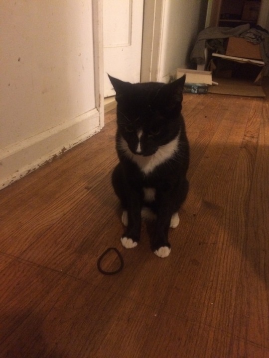 Pictured: Badger the cat, with one of the literally scores of hair ties, twist ties, rubber bands and other fasteners he brings...