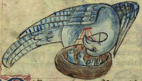 pelicans kill their babies and then bring them back to life by cutting open their own chest and letting the babies drink the blood. every depiction of a pelican looks nothing like a pelican and shows them doing this. I have no clue what the bloodletting bird is meant to be or where they got this from.