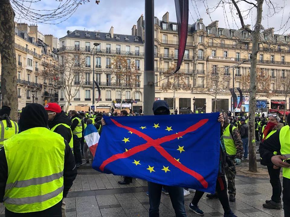 Here we see the red saltire of Saint Patrick’s Cross superimposed over the flag of the European Union, representing the protesters’ desire to see Northern Ireland remain part of the EU after brexit.