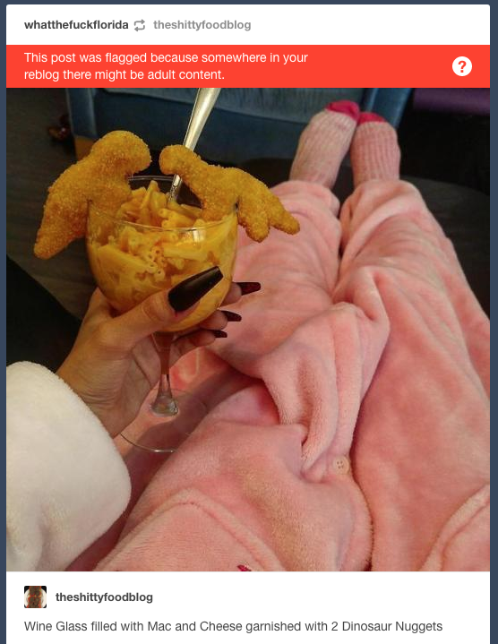 Maybe they’re counting food porn as NSFW too! Jesus tap dancing Christ, Tumblr, this is why you can’t have nice things!