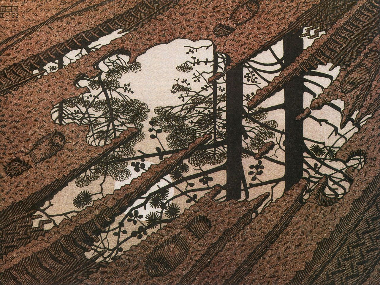 M.C. Escher, “Puddle,” 1952, woodcut printed from three blocks
