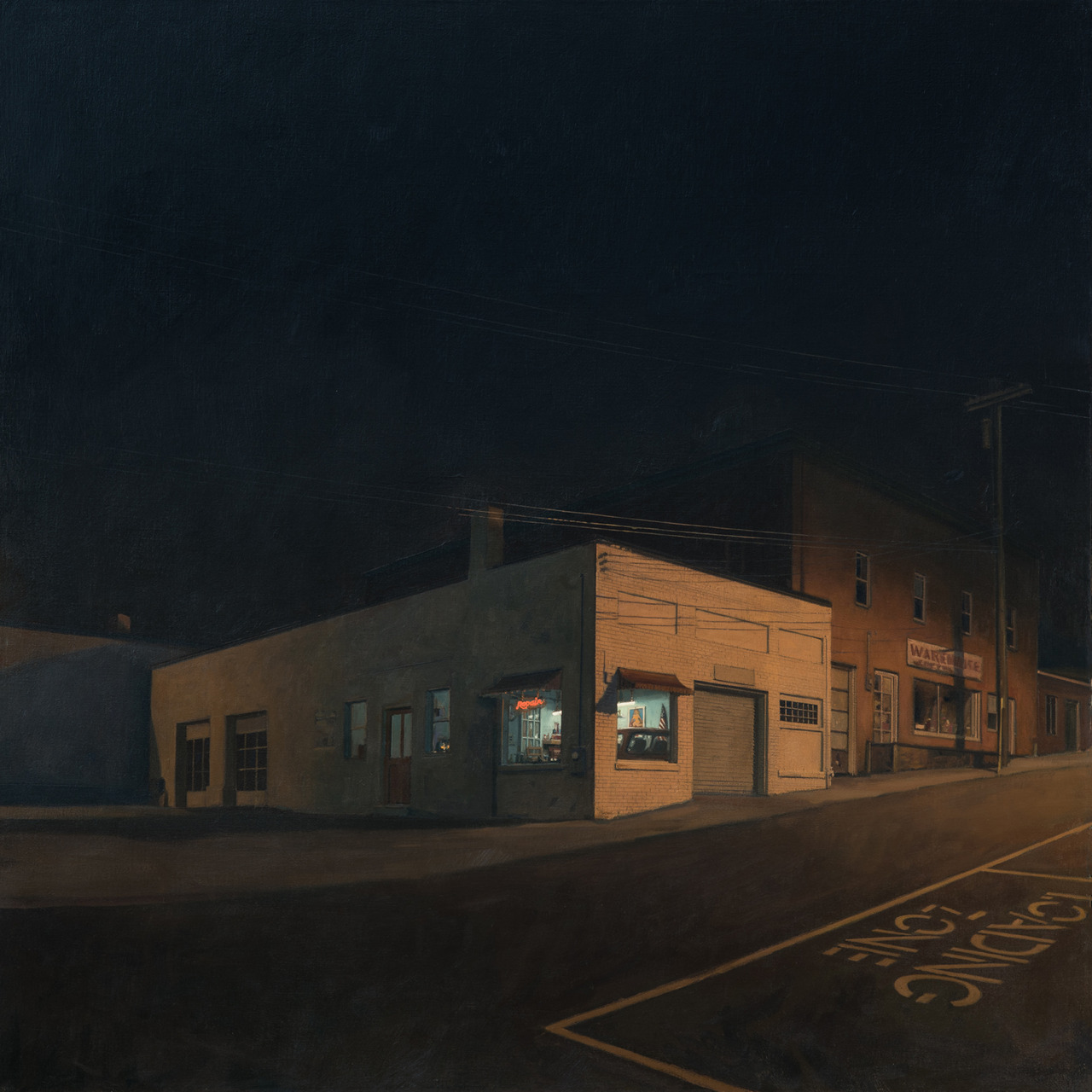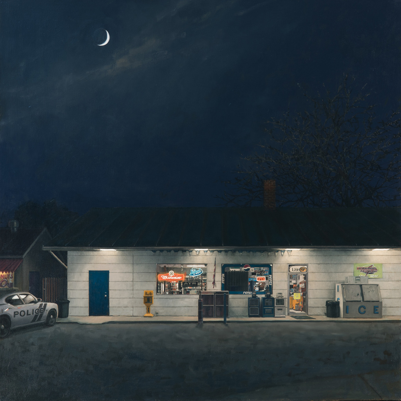 Linden Frederick (American, b. 1953, based Belfast, ME, USA) - 1: Police, 2016 2: Repair, 2016 3: Ice, 2016 4: Dish, 2016 5: Night Off, 2016 6: Mansard, 2016 7: Save-A-Lot, 2016 8: Takeout, 2016 9: 50 Percent, 2016 10: Vacant, 2016 from Night Stories Paintings: Oil on Linen