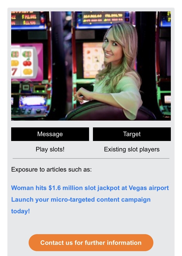 I’m struggling to think what the angle on encouraging a single person to play slots is. Casinos targeting whales individually? Aggravating an addiction so as to improve your positioning in a custody dispute?
