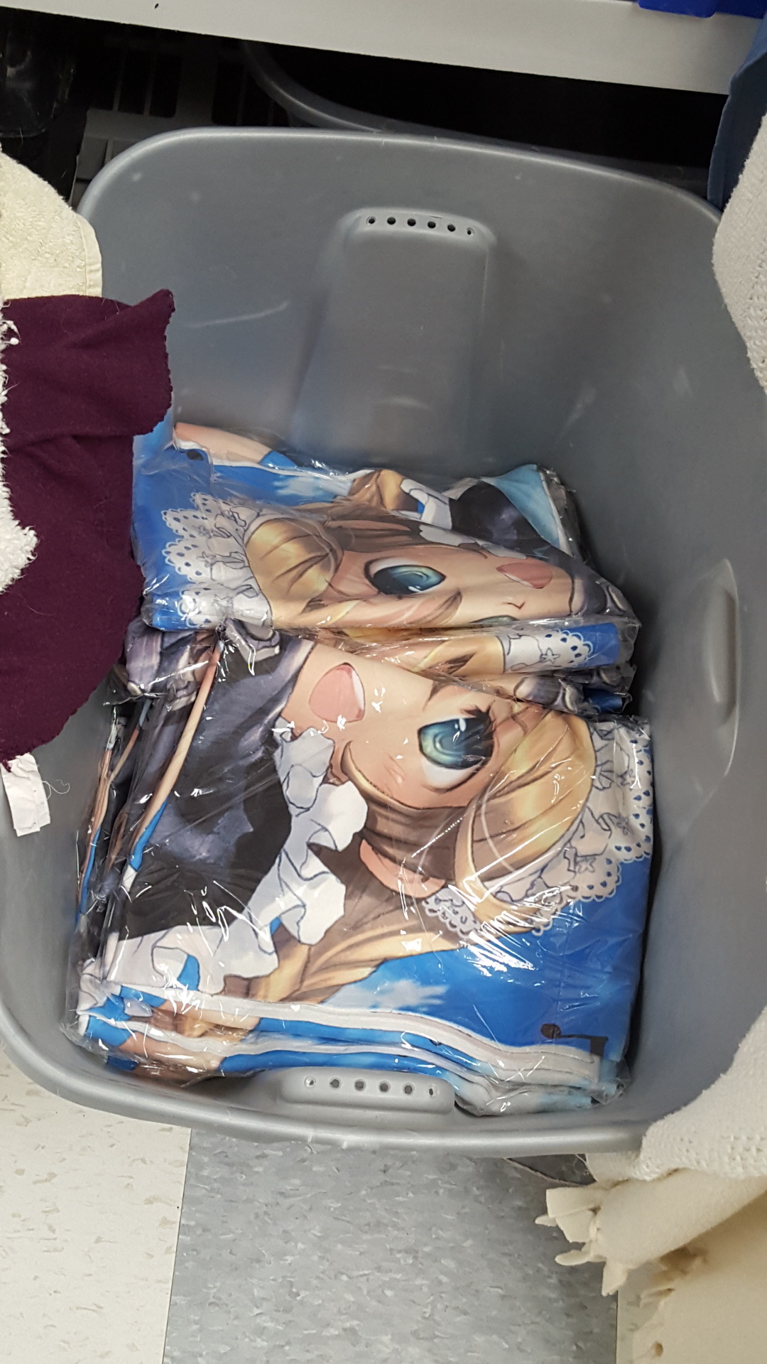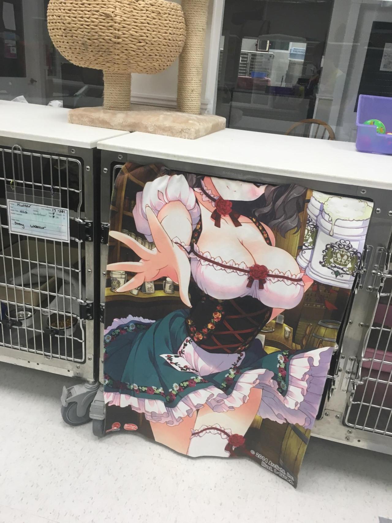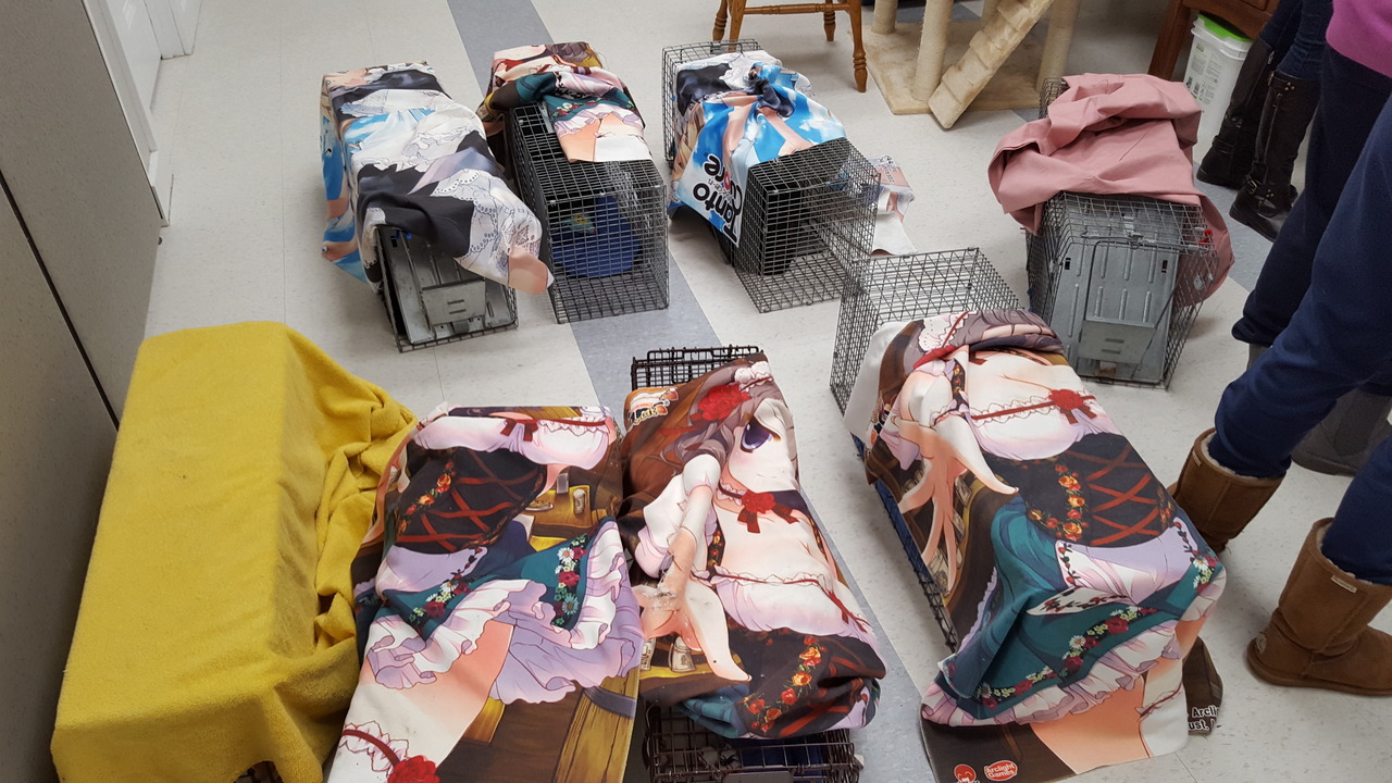 so some local comic book shop accidentally had a shitload of anime girl…. tapestries (I guess?) printed and was desperate to get rid of them so now the cat shelter we go to uses them as cat blankets and it leads to many a funny sight