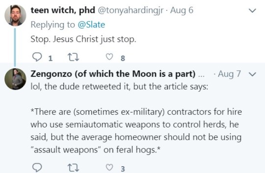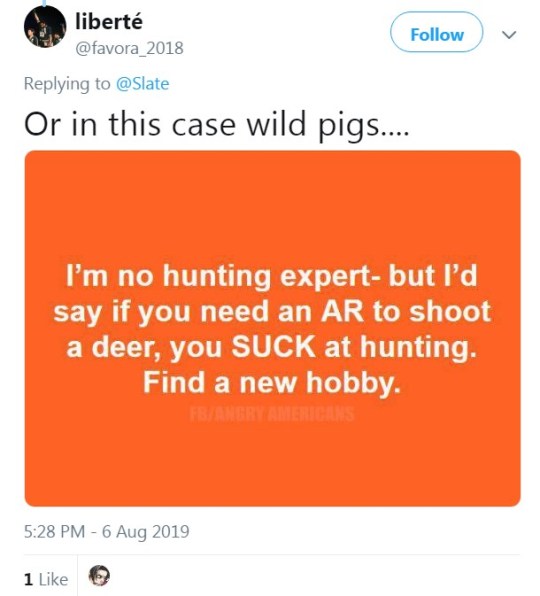 Also, the discussion was about wild pigs, not deer. Feral hogs are, in fact, significantly bigger and tougher than Bambi’s mom. Stop falling back on canned NPC responses and actually think.