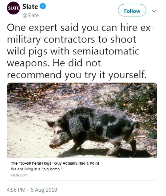 Aaand then they go right back to being out of touch. Many people can’t afford to hire mercenary hunters to drive out to the middle of nowhere just to shoot some Wilburs. This sounds like something a parody of a rich person would do in a comedy movie where they’re forced to work on a farm.