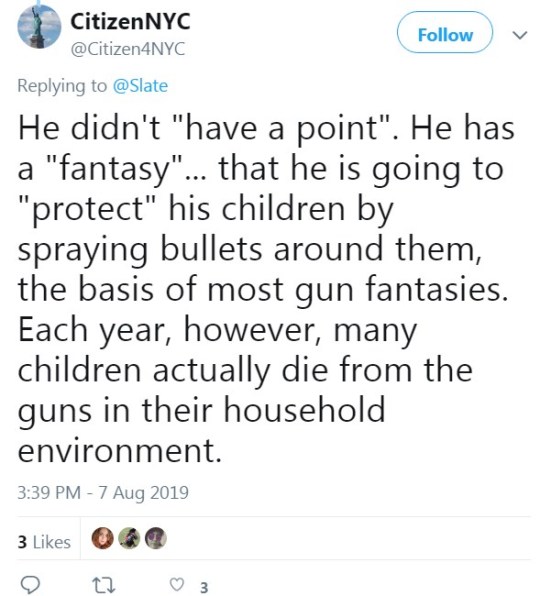 Also, how is “lots of kids die of guns in the home” any sort of counterargument or counterpoint? It’s almost like you’re just hammering to “kids die to guns!” by reflex.