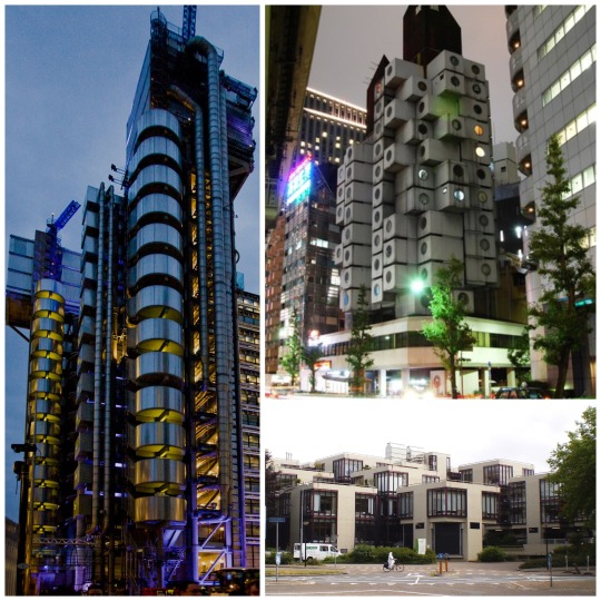 Left: Richard Rogers, Lloyd’s Building (1986) Photo by Lloyd’s Insurance (CC BY 2.5); Top Right: Kisho Kurakawa Nakagin Capsule Tower (1972) Photo by scarletgreen (CC BY 2.0); Bottom Right: Herman Hertzberger, Centraal Baheer (1972) Photo by Apdency (CC BY-SA 3.0)