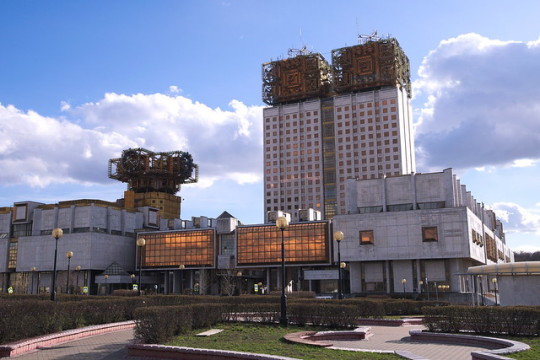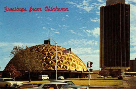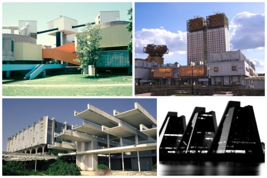 Left to Right: John M Johanson, Stage Center Oklahoma City (1979) Photographer unknown; Yuri Platonov, Russian Academy of Sciences (1968) Photo by Raita (CC BY 2.0); Boris Magasto, Haludovo Hotel, Krk, Croatia (1972) Photographer unknown; Kevin Roche, The Pyramids (1972) Photo by jikatu (CC BY SA 2.0)