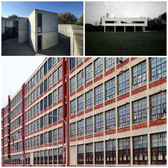 Not Brutalism: (from left to right): Tadao Ando, Vitra Conference Center (1993) Photo by Wojtek Gurak (CC BY NC 2.0); Le Corbusier, Villa Savoye (1929) Photo by Scarlet Green (CC BY 2.0); Albert Kahn, Highland Park Ford Factory (1910) Photo by Thomas Hawk (CC BY NC 2.0)