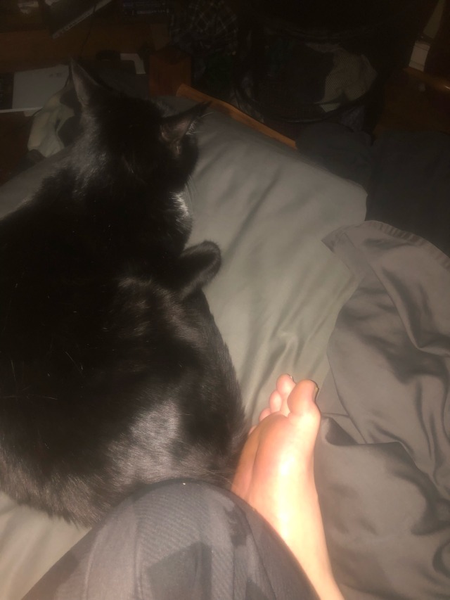 This doesn’t look like much but it’s actually really rare and promising for Badger to be relaxed on the bed with me when I am less than 100% motionless lying down, I’m hoping he’ll start sleeping at my feet, which he’s made some gestures at since kittenhood but skimpers off whenever I even shift my weight a little