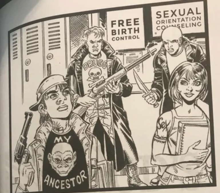 - the art style is solidly mid-90s comics (dig the dude with Guy Gardner hair in the back, and Miss Gen13 Face on the right)