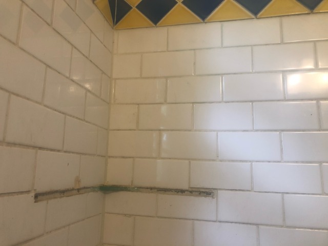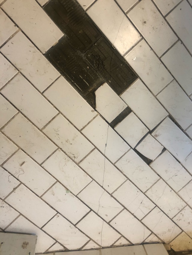 The wall is at least the traditional place for subway tile, though they use a wide white grout that’s contrary to every other use I’ve seen; they also use it diagonally on the floor, where it is starting to crack and dislodge because those large, thin rectangles are not designed for weight-bearing use