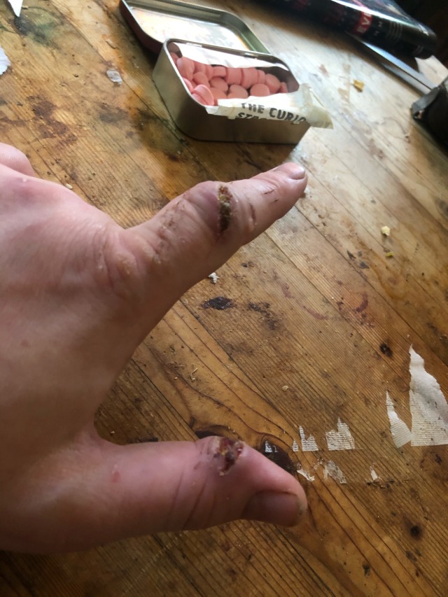 It hurt a lot, I ran inside and once I had stood in front of the kitchen sink long enough alternating raising the hand above my head to cut pressure and dipping it down into the stream to rinse off all the blood, it was one of those bad wounds that doesn’t make it to the tendons but still looks like a mass of pink fleshy worms
