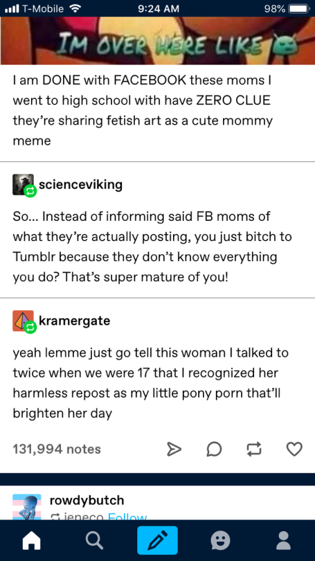 hey Emily I know we haven’t talked in 5 or 6 years, how’s it going? kids doing good? pregnancy going okay for you? anyway I sent you this because some rando on the Internet thought you might be happier knowing you inadvertently reposted MLP fetish art. wait what’s MLP? well okay let me start off with saying I am a completely normal individual caught in the crosshairs of a violently loud subculture on the internet I am not actually a part of but I constantly bear witness to. secondly does your kid watch cartoons? well you might have seen